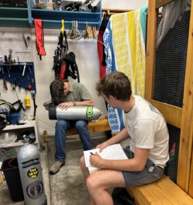 <p>While staying at SPMC, Teagan and I got a chance to work on some of the behind-the-scenes aspects that go into a scientific dive class. The first of which was helping Capt. Nate Schwarck with visual inspections for most of the tanks at Shannon point. This was a great learning opportunity and a fun way to learn more about what goes into being a DSO at a marine lab.</p>