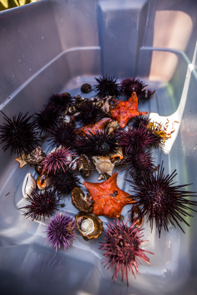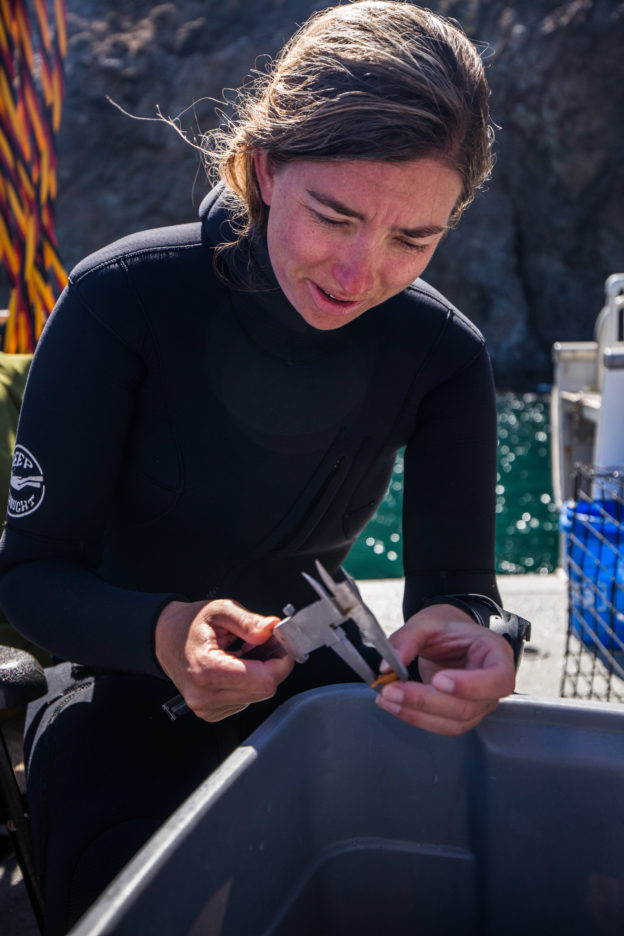 <p>The Kelp Forest Monitoring team does a lot of sizing of invertebrates, as a robust collection of sizes can be used to glean information of recruitment events and potentially even die-offs. Sizing, however, can take a fair amount of time. Calipers are used for precise measurements and sizes must be physically written down – which all sounds easy and quick but can really add up when you’re trying to size at least 200 urchins at each site. Additionally, time spent underwater is limited, so it must be maximized to its full extent. At sites where urchins are abundant, these inverts are sometimes brought up to the surface to be measured in order to increase efficiency. It seemed like after almost every time I returned to the back deck post-dive there was part of the team sitting out there sizing something.</p>