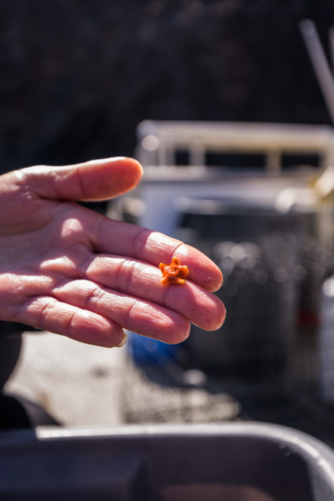 <p>In addition to the urchin size frequencies, there was a whole other source of need for sizing – artificial recruitment modules, or ARMS. These, essentially little stacks of halved cinderblocks designed to create available and desirable habitat for juvenile invertebrates, are a way for the KFM team to learn a little bit about waves of larval recruitment happening inside their park. Each year, these modules are visited, taken apart and picked clean of their invertebrate residents, brought up to the surface, sized, and then brought back down and put back away in their little artificial homes. This task was a coveted one by the team, and was described to me as the kelp forest monitoring equivalent of opening a Christmas present – you never really know what you’ll find inside. I grew to agree with them, it was always a fun surprise. Sometimes you’d get nothing but some small urchins and a what seems a couple hundred brittle stars, and other times you’d be greeted by a mother octopus and her clutch of eggs (no, we didn’t bring those up to size them as well).</p>