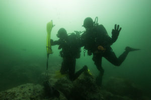 <p>I joined up with the KFM team Monday morning and before I knew it we were off to the islands. With no time to waste, we’d be going straight to our first survey site and going straight to work as soon as we’d arrived. We had a couple hour boat ride on the way out, giving me plenty of time to read up on the group’s survey protocols and to prepare myself for some cold-water diving. While I’m not a stranger to diving in chilly seas, it had been a couple months since I donned a drysuit for Isle Royale’s 36-degree waters, so I had a little bit of setup in front of me.</p>