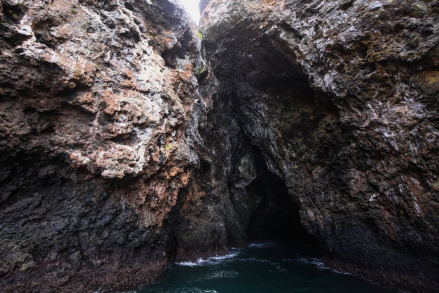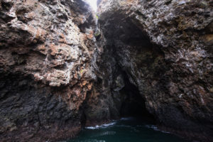 <p>After finishing up our site on Santa Rosa Island, we headed off to the neighboring Santa Cruz Island for our next stop. Santa Cruz, the largest of the northern Channel Islands, also has the most native vegetation – the result of a huge effort to remove introduced grazers and reestablish a natural landscape. This made for a beautiful commute, getting a chance to view these sheer sea-cliffs and the greenery that blanketed them. We also got a chance to visit a unique Santa Cruz Island feature – the Painted Cave. One of the largest sea caves in the world, this enormous cavern extends a quarter mile into the island with an opening big enough to fit a 60-ft boat into it. Keith Duran, the skilled captain of the Sea Ranger II, brought the vessel all the way into the cave to give us a close look.</p>